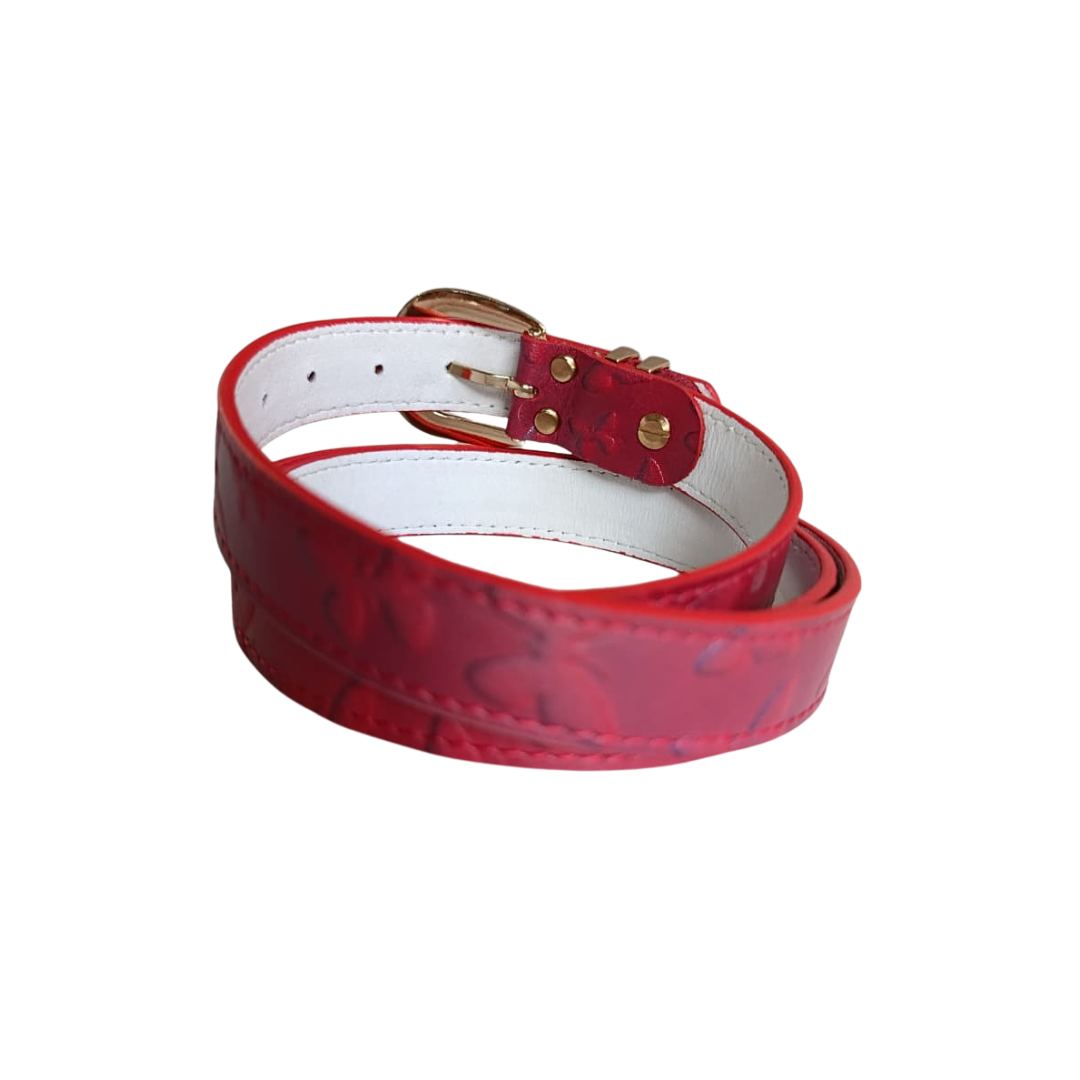 Cinturon con diseño elegante, en cuero grabado Rojo. Fácil de ajustar, pensado para adaptarse a diferentes necesidades y preferencias. Hecho a mano por artesanos expertos, cada pieza refleja dedicación y excelencia.
