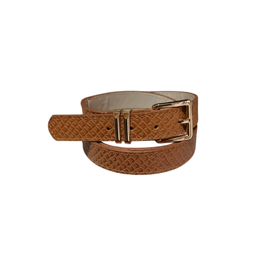 Cinturon con diseño elegante, en cuero grabado miel. Fácil de ajustar, pensado para adaptarse a diferentes necesidades y preferencias. Hecho a mano por artesanos expertos, cada pieza refleja dedicación y excelencia.